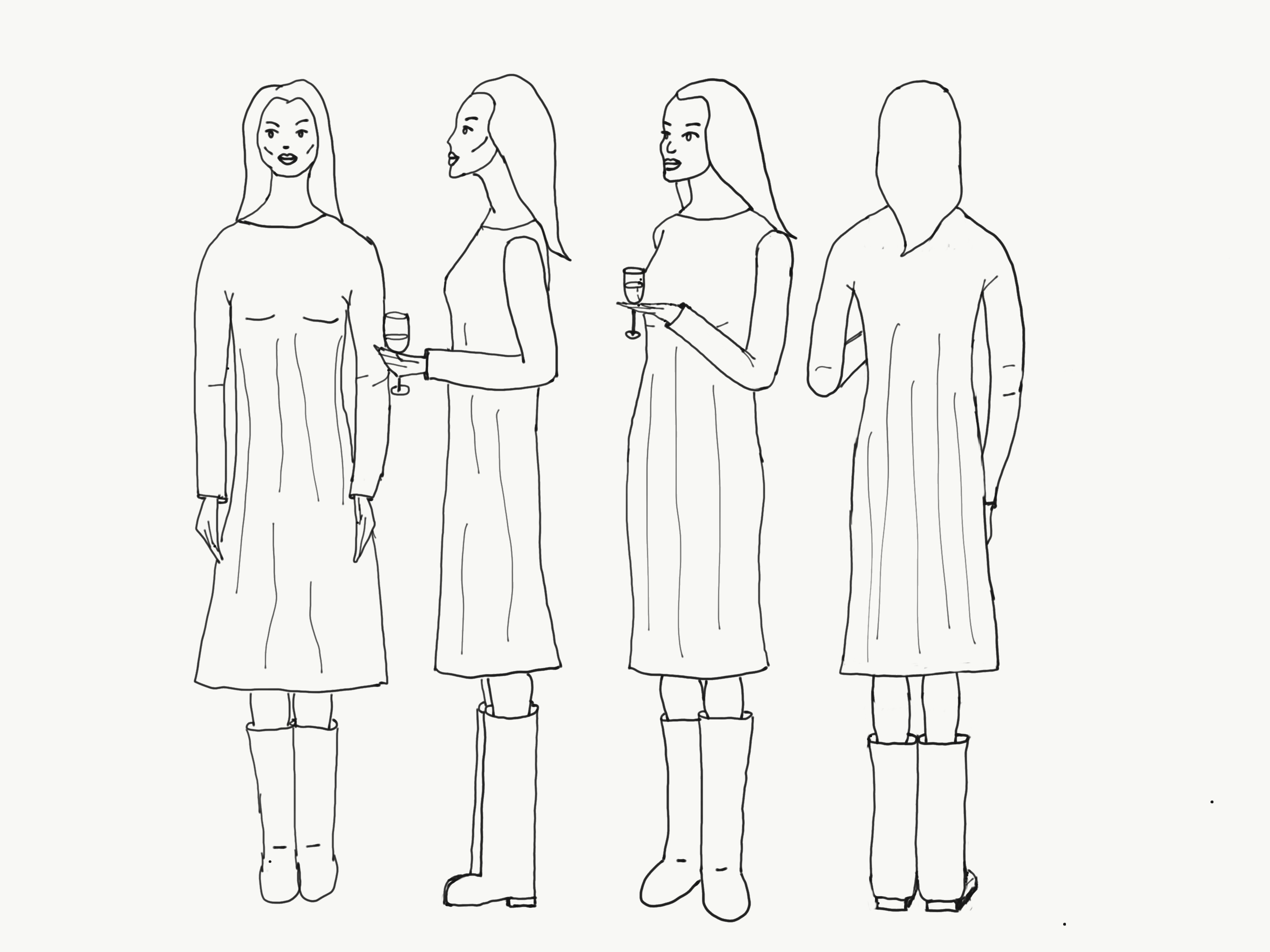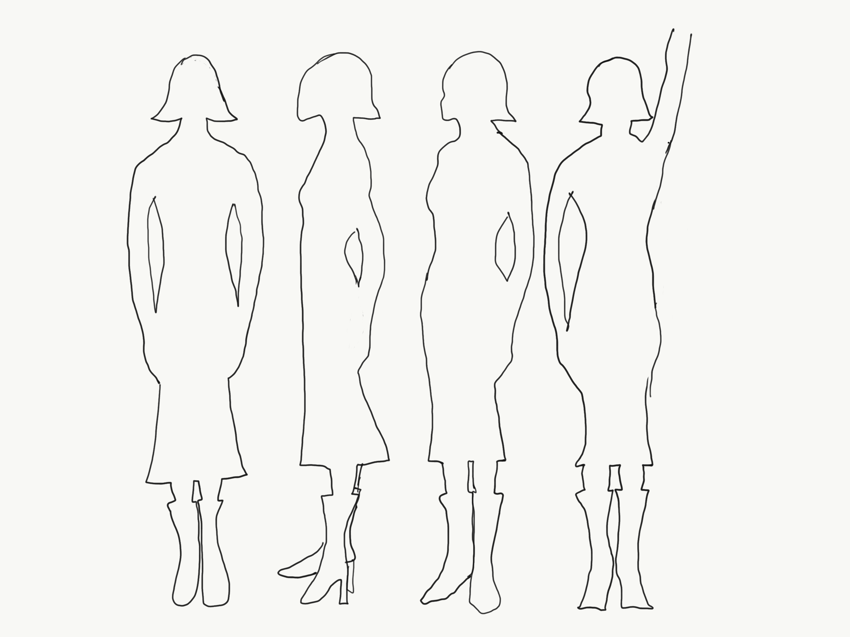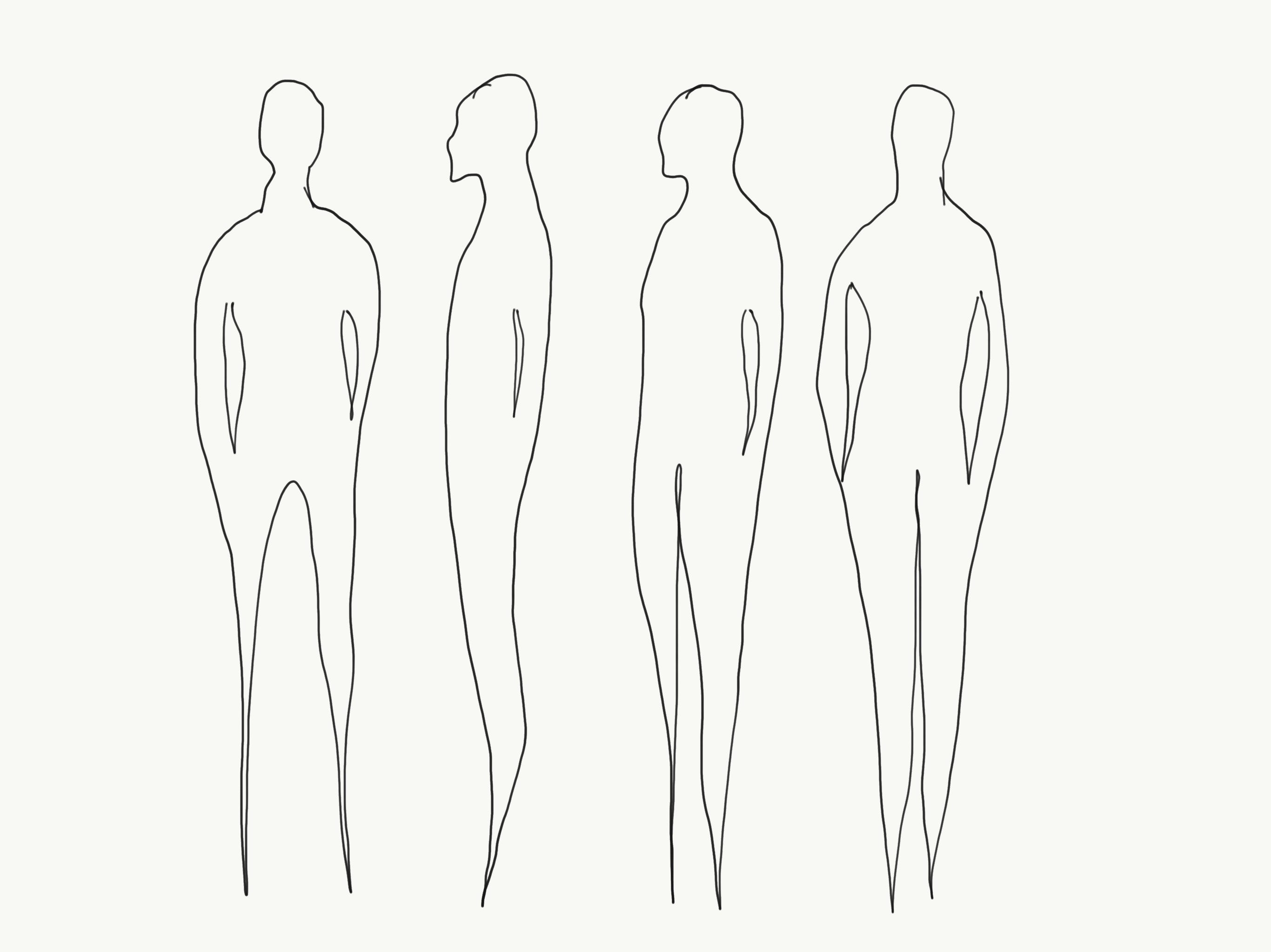I downloaded an image of female body proportions, made it less opaque and drew over it in another layer. I believe if I keep drawing this way I will get the hang of the proportions. Hands and feet are still very tricky, but the guides helped a lot. Third figure, at a slight angle seems to be the most useful for interior design visualisations. I realise this body type may not be most representative, or inclusive, but I’ll get to those later, when I understand proportions better.