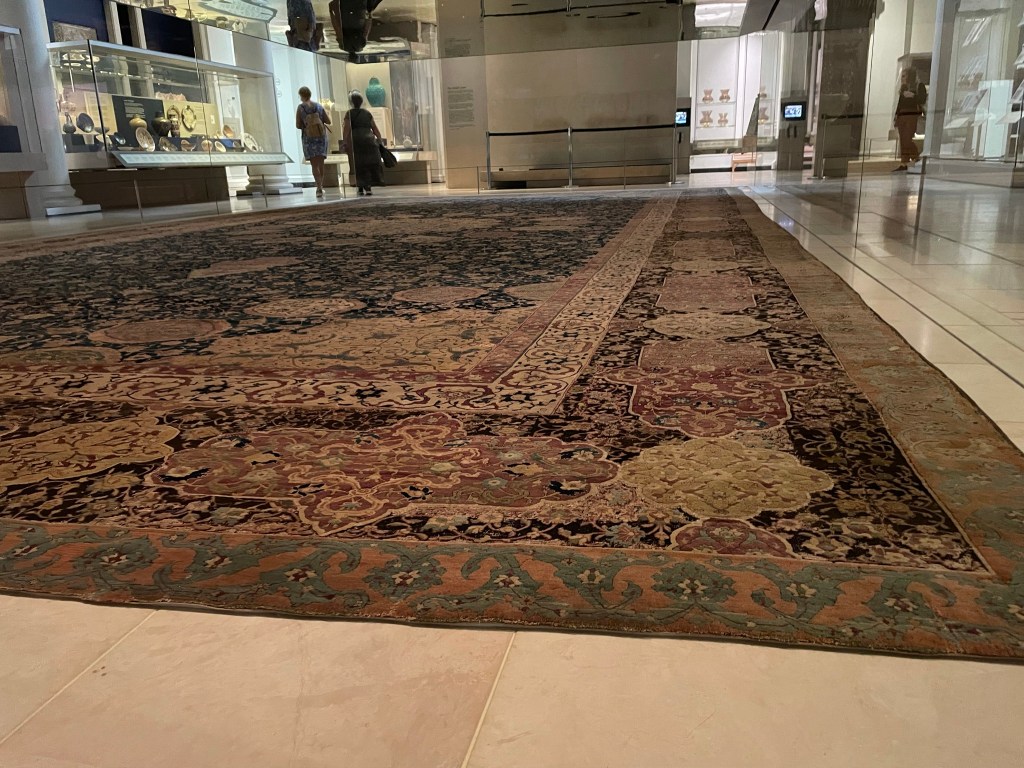 There’s a carpet on the floor, hard wearing type. It has geometrical pattern of blue and black with cream specks.