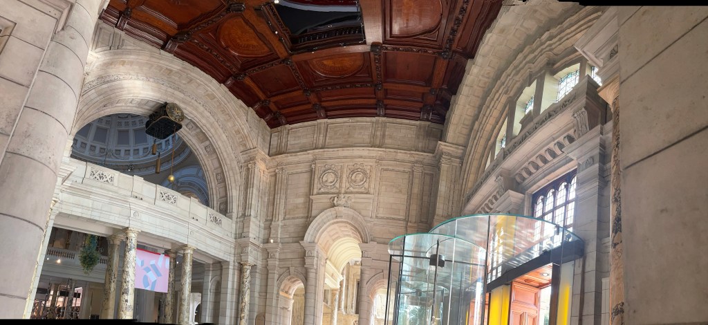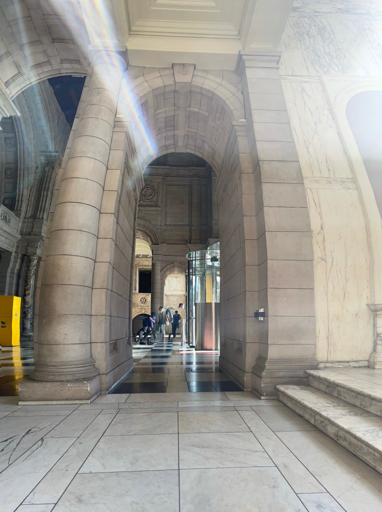 Then the library opened to the public for the day, people started to come in, the place got louder, the sounds changed. At first it was mainly staff on the phone, people walking, someone hoovering in the distance. Suddenly it got crowded, place got instantly busy. Loud talking, multiple conversations at once, steps everywhere, squeaking floorboards, items laid out on tables, rustling of paper, someone sighed.